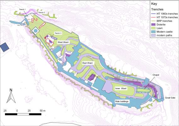 The earliest material uncovered was animal bone that had radiocarbon dates from the Roman period. No structures were seen of this date, but clearly at that time people were already living on the castle rock. The most fascinating finds were early stone structures, walls and at least one building, all predating the 12th century as they were beneath the foundations of the 12th century chapel that itself had been built upon in the late 18th and early 19th centuries.